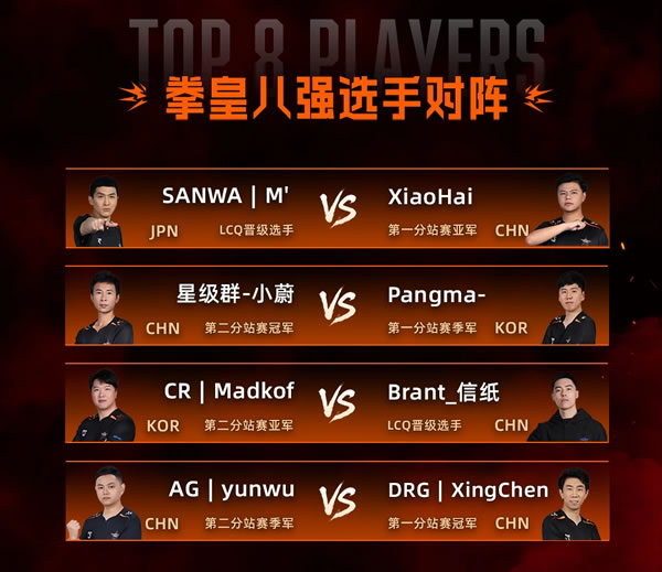 《拳皇15》项目:XingChen、XiaoHai、Pangma、小蔚、Madkof、yunwu、信纸、M’。首轮对阵如下: