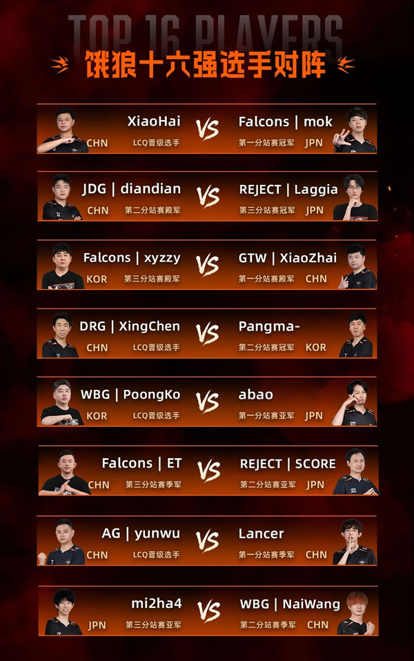 《饿狼传说:群狼之城》项目:mok、abao、Lancer、XiaoZhai、Pangma、Score、NaiWang、diandian、Laggia、mi2ha4、ET、xyzzy、XiaoHai、yunwu、PoongKo、XingChen。首轮对阵如下: